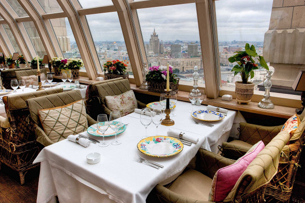 Площадка open air под шпилем гостиницы «Украина» — это круговой балкон на 34-м этаже высотки с бесцеремонным ветром и панорамой как из космоса: районы, кварталы, жилые массивы, подробный план Москвы в натуральную величину. Балкон окружили стеклянной колбой, иначе реально сдувает. Кормят по-итальянски: гребешки на гриле с фенхелем, равиоли с кроликом и цветками цукини, классический пьемонтский тартар и здешний хит — паста, замешанная в голове пармезана, — поддерживают иллюзию итальянского отпуска. Официанты утверждают, что в бокалах с шампанским каждый день оказывается с десяток обручальных колец.