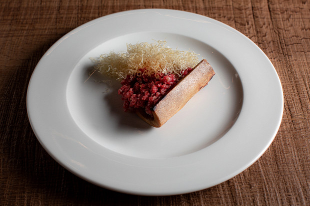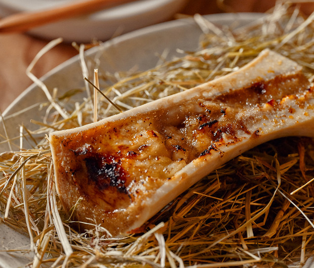 Формат ресторана от заслуженного производителя мраморной говядины, снабжающей стейками половину заведений города, предполагает перфекционизм во всем, что касается мяса. Костей в том числе: сначала мозг внутри косточки доводят до соусного состояния. Затем подселяют к нему говяжий тартар, используя мусс из мозга в качестве скрепы вместо привычного сырого куриного желтка, и немножко пикантного айоли. Все это вновь пакуют обратно в спил внушительных размером мозговой кости, водружая сверху объемную шапку из завитков хрустящего картофельного хвороста. В такой элегантной подаче кости можно предложить даже тем, кто считает поедание субпродуктов в принципе признаком каннибализма.