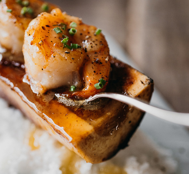 Вся концепция этого пышущего энергией ресторана заточена на дыме, копчении и том самом брискете, который умеют готовить исключительно в штате Техас. Шеф-повар Алексей Каневский сам конструирует грили и печи и выдумывает удивительные вещи, которые поднимают в целом уличный жанр барбекю до ресторанных высот. Костный мозг с лангустинами — как раз из таких возвышающих парадоксов. Раскаленная кость лежит на сугробе из крупной соли, рядышком розовеет обнаженный лангустин, и задача едока — захватить одним уколом вилки и то и другое, чтобы почувствовать гармонию, которая воцарится во рту между расплывчатой жирной текстурой мозга и мясистой лангустиновой мякотью. Закусывать предлагает микродайконом, чтобы освежить и заострить восприятие, четче зафиксировать вкус этой идеально подобранной пары и тем самым поставить мощный восклицательный знак в конце предложения.
