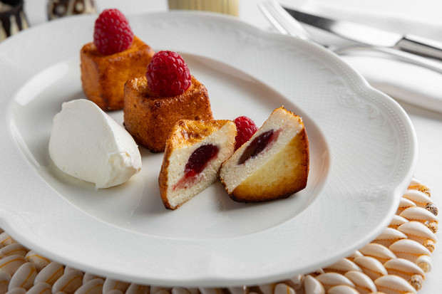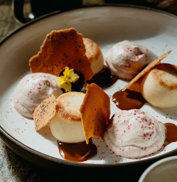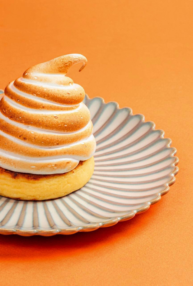 Редкая композиция из классического сырника и воздушной заварной меренги. В основании конструкции лежит один сырник, а второй прячется внутри меренги. Гармонии этому неожиданному набору придает гель из малины.