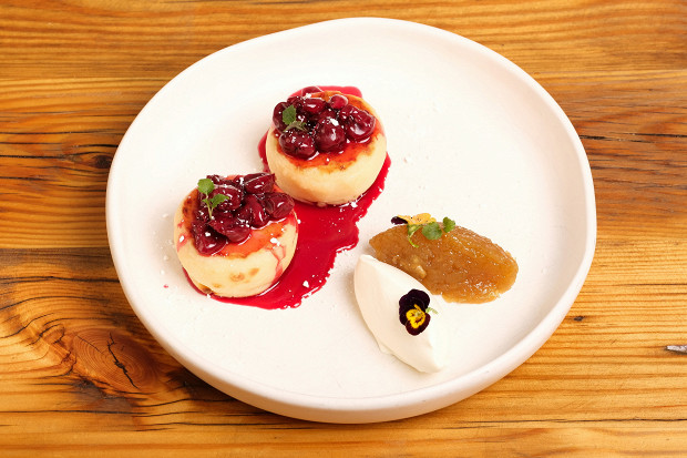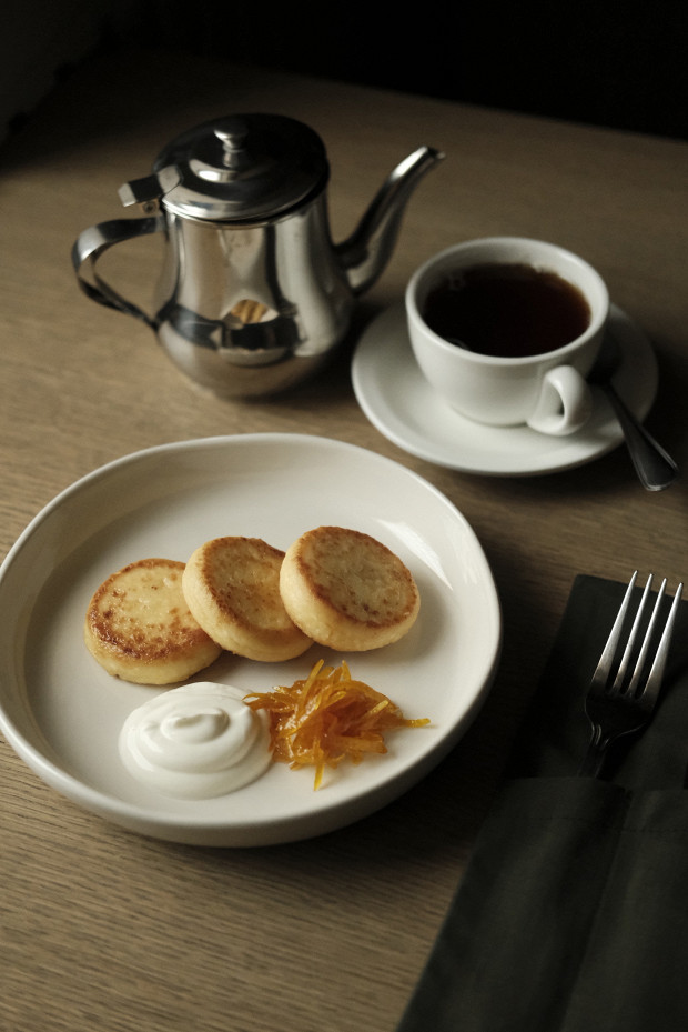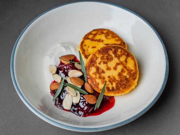 Ресторан с перепридуманной грузинской кухней, и сырники тут такие же — чуть модернизированные. Готовят их из творога, соединенного с грузинским сливочно-творожным сыром надуги, добавив для основательности и легкости рисовую муку вместо пшеничной. Подают сырники с чипсами из тюлипного теста с маком, кремом из брусники с мацони и соусом из вареной сгущенки с корицей.