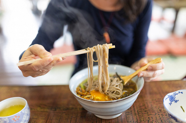 «Японцы никогда не тянутся к стоящей на столе индивидуальной плошке с лапшой или рисом, рискуя половину содержимого по пути вывалить на стол. Нет, гораздо удобнее поднять миску левой рукой и держать ее где-то на уровне груди, а второй рукой орудовать палочками. Подносить миску близко ко рту тоже не стоит — тогда вам нужно будет резко отвести в сторону локоть, чтобы использовать палочки, и вы рискуете ударить соседа».