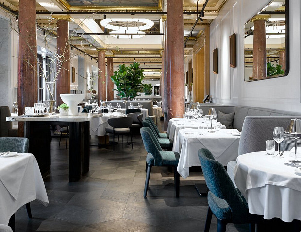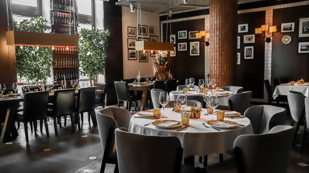 Торжественный ресторан в гостинице «Метрополь», аккурат напротив Большого и Малого театров. Внутри — колонны, мрамор, золото и блеск хрусталя, наглаженные скатерти и не менее торжественное меню шефа Андрея Шмакова: тут и русская кухня, и французские гастрономические традиции, и фантазии титулованного шефа.