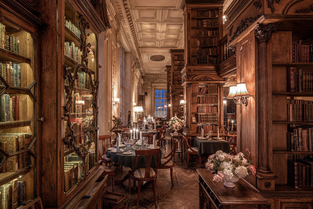 Самое, пожалуй, неожиданное место из списка. Зал «Библиотека» в «Пушкине» предназначен прежде всего для камерных банкетов, но Андрей Деллос не был бы самим собой, то есть дотошным реставратором исторических интерьеров, если бы вместо реальных книг поставил на полки муляжи. В результате в старинных резных шкафах уместилось более 300 томов изданий XVIII — начала XX века. Пожалуй, это единственная библиотека в Москве, когда столь дорогие книжные экземпляры в тесненных золотом обложках можно взять с полки просто так, не заполняя абонемента. Антураж соответствует: тут и старинный глобус, и часы с боем, и антикварная печатная машинка. Да и само меню со всеми его ятями, ростбифом «а-ля мод» и «оливье тре деликат» создает иллюзию абсолютного погружения в атмосферу русского романа.