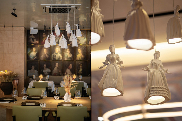 Самый масштабный арт-объект — галерею портретов «Машенек» из разных веков русской истории — поместили на дальнюю стену, создав эффект неожиданности. Присмотритесь внимательно — среди девичьих лиц есть одно как будто из нашего времени, и не случайно — так, разместив стилизованный портрет среди прочих красавиц, ресторатор поблагодарил своею «правую руку», СЕО ресторанов Раппопорта Марию Горелову (кстати, в первые дни после открытия вы имеете шанс увидеть живьем прототип, вносящий последние коррективы в работу ресторана).