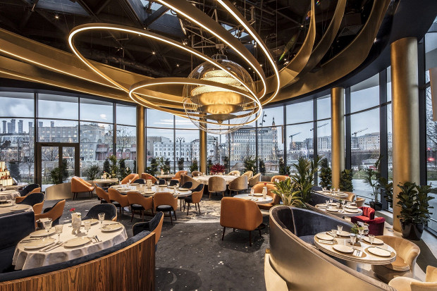 Панорамный ресторан в Зарядье с видом на Васильевский спуск. Сестры Сундуковы оформили его в духе ретрофутуризма с оглядкой на 1960-е, когда только и говорили, что о Гагарине и Титове. Под потолком Сатурн, Млечный Путь и звезды, по периметру барельефы с космическими сюжетами. В меню — ремейки на блюда союзных республик, плюс устрицы и икорный бар.