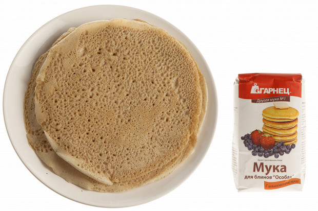 На упаковке не прописаны нужные пропорции, и непонятно в каких количествах брать муку, воду или молоко: производитель лишь советует довести тесто до сметанообразной консистенции. Мы добавили воду, но нужная консистенция выглядит неприятно, тесто слишком блеклое. Если вы не умеете печь блины, то даже не пытайтесь готовить из этой смеси — скорее всего будете разочарованы. У нас готовые блины оказались тонкими, дырчатыми, с застрявшими в плоти блина комочками — и очень пресными, по консистенции и вкусу напоминающими клейстер. Покупать такую муку не надо.