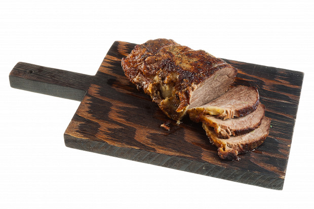 Запеченное в течение 3 часов мясо приобрело нежность и мягкость, отчасти потеряло свой брутальный характер, зато стало больше похоже на вырезку. Мы немного пересушили мясо, его можно было бы запекать и 2,5 часа, но оно все равно осталось сочным, что говорит о его качестве. Можно есть как горячим, так и холодным, например, добавлять ломти в сэндвичи.