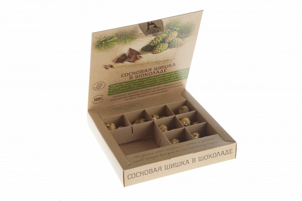 Шоколад с инкорпорированными сосновыми шишками и клюквой — без всяких скидок превосходный продукт, к тому же на красивой деревянной дощечке, которая еще больше усиливает желание его купить. Сосновые шишки с шоколадом и кедровыми орешками тоже чудо как хороши, внутри — как будто сосновый джем.