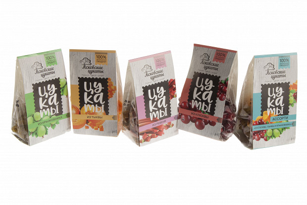 Напоследок мы оставили продукт, который понравился безоговорочно нам всем. Больше того, привел в восторг. Эти псковские цукаты хороши все без исключения. Из ревеня — кисленькие, чрезвычайно ревеневые, сахара в меру. Из клюквы — это большие вкусные кисло-сладкие ягоды, которые можно и на торт сверху положить, и в салат бросить, да и так есть — не оторваться. Крыжовниковые похожи на вид на изюм — и на вкус тоже, но с послевкусием крыжовника. А тыквенные — это просто огонь: очень сочные, и яркий их вкус — не столько тыквенный, сколько арбузно-дынный даже, бахчевой. Такое надо на экспорт поставлять.