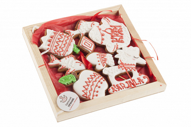 Эти карельские козули делает мастерская Виктории Шиловой в Петрозаводске, основанная в 2016 году. Виктория примерно то же, что Оксана Перова и ее «Пасека Юньга» в Ижевске: целенаправленно создает бренд съедобных сувениров, основанных на национальных традициях места. По сути своей это вкусные имбирные пряники — с украшениями в карельско-туристическом духе. Хороший продукт; разве что глазури многовато. Да ну и пусть.