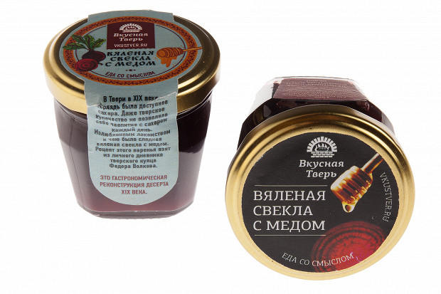 В баночках — один и тот же продукт, просто в разном дизайне: окончательный вариант еще, вероятно, выбирают. Это варенье по рецепту тверского купца Федора Волкова, и дают его на гастрономической экскурсии «Тверские сладости» в рамках проекта «Вкусная Тверь». (Есть еще экскурсии «Пивная Тверь», собственно, «Вкусная Тверь», где пробуют блюда по старинным тверским рецептам (что здорово), и даже «Тверь Михаила Круга».)