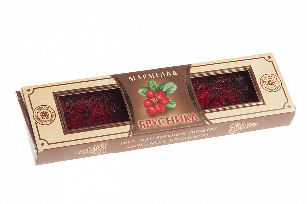 Еще один продукт из Нижневартовска: мармелад из брусники и с брусникой. По сущности — гибкий, как чемпионка мира по художественной гимнастике. По текстуре — липковатый. Красиво-прозрачный на свету. А на вкус — все лучшее, что есть в бруснике, в желированной форме. И еще сама брусника попадается — да вон она, даже на фотографии видна в мармеладе.