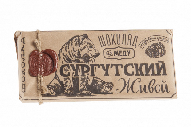 На этом сверхремесленном шоколаде, на обороте упаковки, слова, бьющие в самое сердце потребителя, который считает себя ответственным: и органический, и био, и натуральный. Да и на лицевой тоже: на меду и еще живой. Кому он живой? Зачем он живой? Затем, что он не проходит термическую обработку: как можно узнать на сайте производителя, сургутской компании «БиоШокоЛайф», нагрев до 36 градусов они таковой не считают. Обратите внимание на сургуч: он действительно настоящий, и им действительно проштемпелевали упакованную плитку — откроете и увидите внушительный след на шоколаде. Кстати, как вы думаете, кто изображен на упаковке, медведь или тигр? У нас мнения разделились.