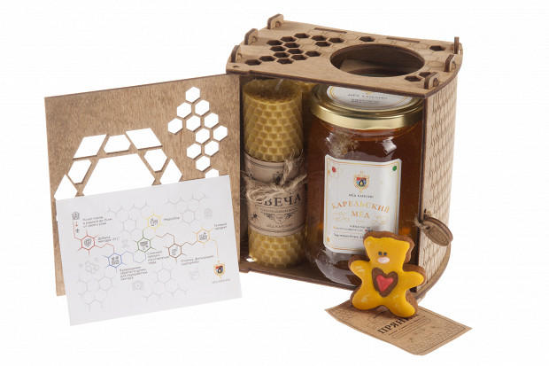 Хороший способ продать мед красиво: такие медовые наборы можно купить в нескольких магазинах и ресторанах в Петрозаводске, а также в нескольких карельских пансионатах и базах отдыха. В деревянной коробочке — банка отличного меда и две восковых свечи. Крошечный медовый пряник — как бесплатный бонус. Пряник симпатичный и вкусный. А еще вложена красивая листовка про путь меда — на центральном месте «Сложный процесс изготовления меда».