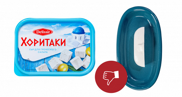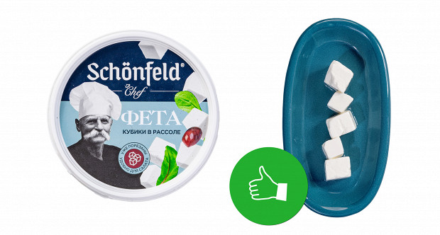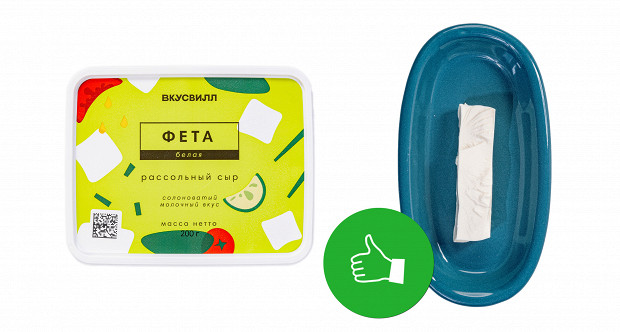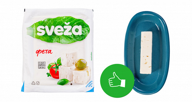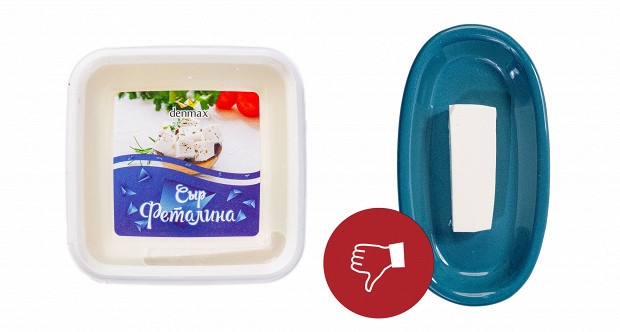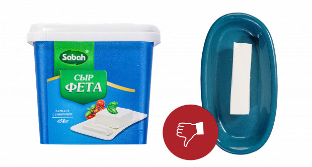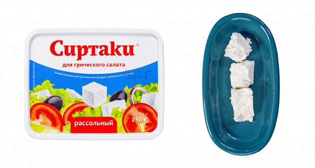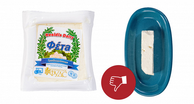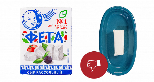 Выглядит этот образец странно, напоминает полутвердый сыр типа «Российский». У него странный желтый цвет. У него абсолютно сырные плотность и текстура: если фету можно размять вилкой прямо в салате, то этому образцу нужен только нож. Короче, это обычный полутвердый сыр. При этом если не думать о греческом салате, то сам по себе он неплох. Напоминает хорошую моцареллу для пиццы. Наш вердикт: есть можно, в салат — никак. Ставим минус и плюс.