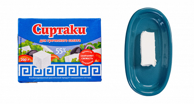 Текстура у этого сыра слишком рассыпчатая и она не похожа на ту, что нужна нам в салате. Но сам по себе вкус весьма неплох: в меру кислый, в меру сливочно-молочный, в меру соленый, и раскрывается он тихо, аккуратно. Например, «Сиртаки» отлично себя поведет в качестве намазки, если соединить ее со всевозможными травками, чесноком и каплей оливкового масла. Но салату она не подходит: там нужна текстура подсобранней. Вкусно, но не фета.
