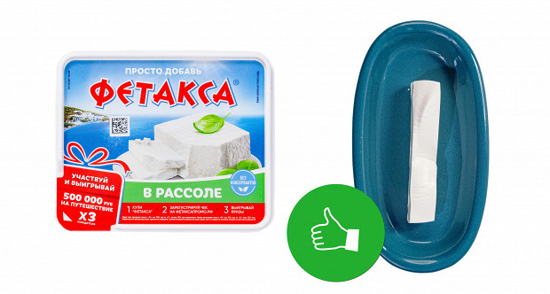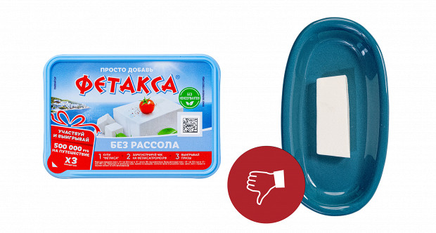 По текстуре что-то среднее между плавленым сыром и кислым тофу, и, как и заявлено, без рассола. При этом у плавленого сыра есть приятная маслянистость, а этот дает только эффект ваты во рту. В салате такой образец расползется в кашу. Да, собственно, на упаковке так и написано «сыр плавленый фетакса». И состав у него слишком уж мудреный, не имеющий ничего общего с обычной фетой: сыр рассольный, сыр полутвердый, масло сливочное (!), концентрат молочного белка, пахта сухая, молоко сухое обезжиренное, соль, желатин пищевой, лимонная кислота. Нам этот вариант совсем не интересен. И в салате мы его видеть не хотим. Ставим два минуса.