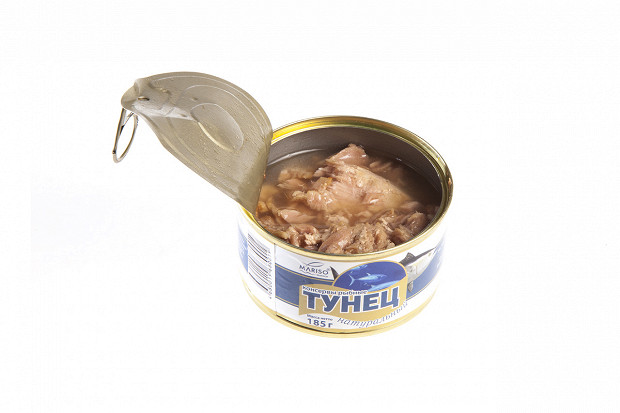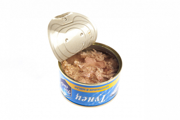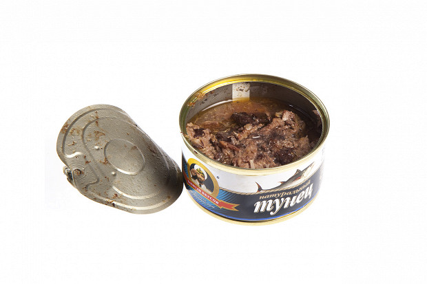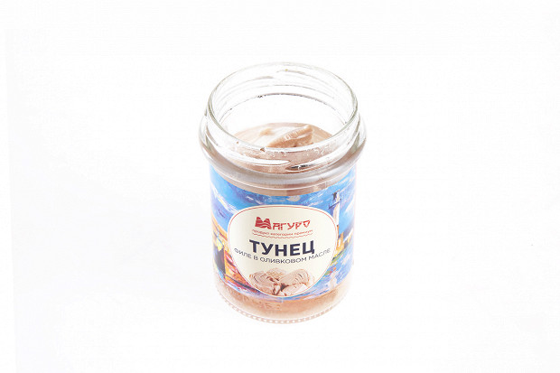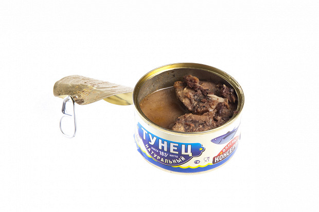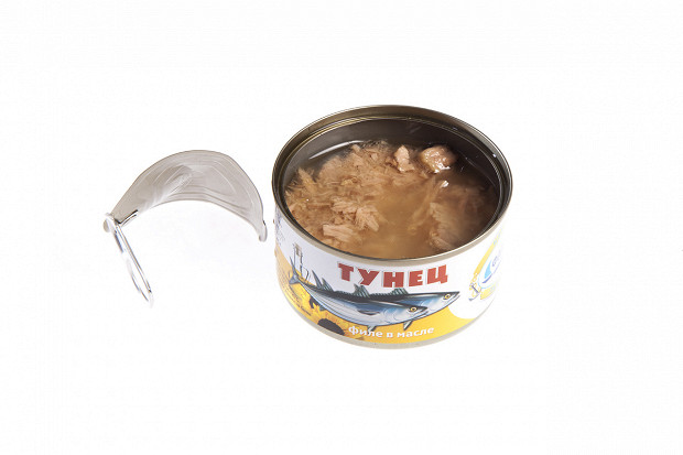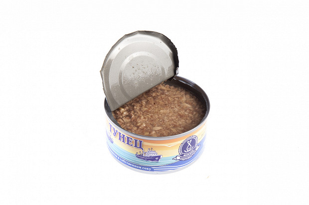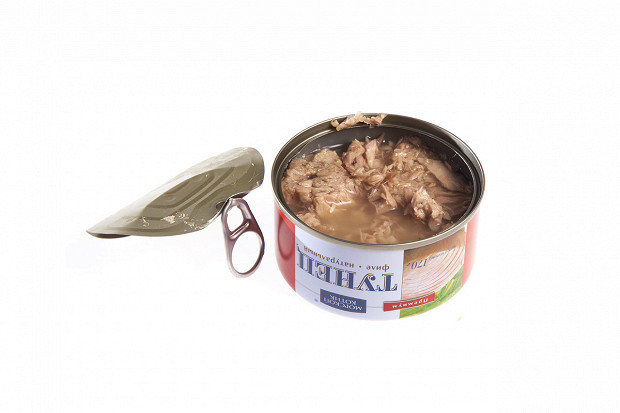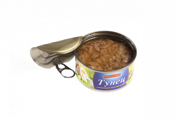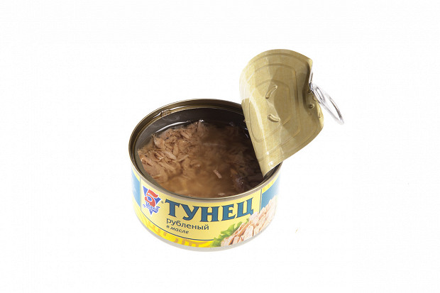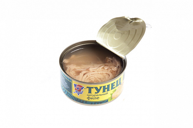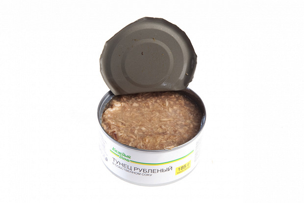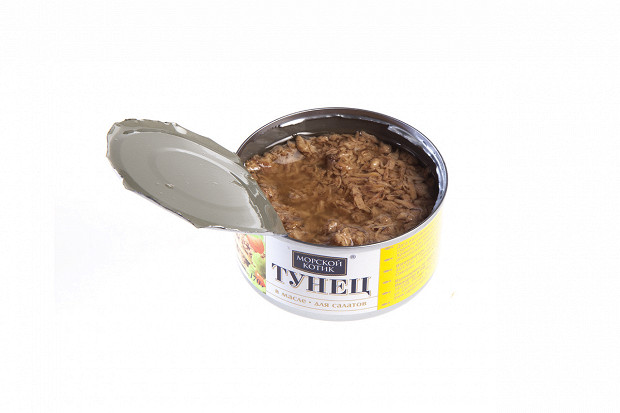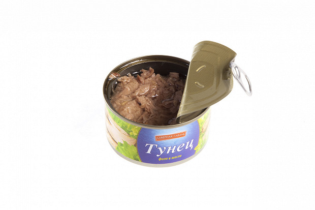 Лошманов: Последняя банка. «5 морей», тунец натуральный. Судя по этикетке, внутри должно быть крупные куски мяса. (Открывает.) О! По виду — прямо прекрасная рыба. Рубленое филе — как на картинке. Розового цвета рыба, прямо для салата.