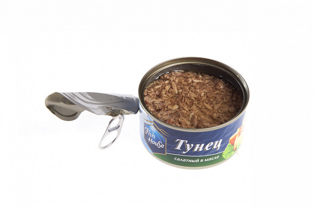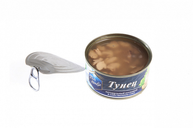 Лошманов: Тунец натуральный кусковой в собственном соку Fish House. Предыдущий Fish House, измельченный, у нас в помойке. А это кусковой, и сделан он в другой стране — в Китае. (Открывает.) Выглядит симпатично. Разобрали для салата на ошметочки — видимо, это ручной труд. Здесь даже чешуя есть.