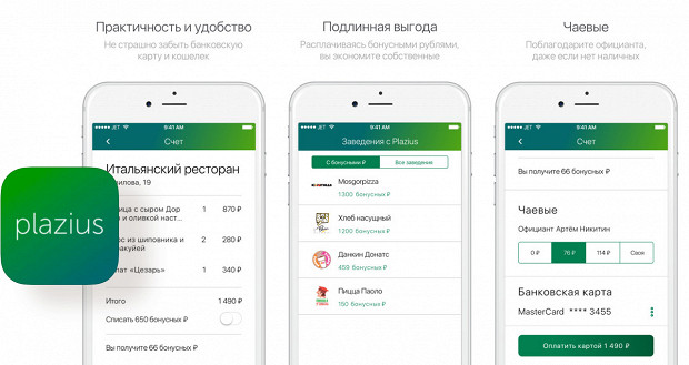 Как это работает. Во-первых, система позволяет копить бонусы и использовать их в ресторанах и магазинах, входящих в систему Plazius. В системе зарегистрированы многие ресторанные сети, например, «Хлеб насущный», Dunkin’ Donats, «Кофе-хауз», «Джон Донн», «Китайские новости». За каждый чек пользователь получает баллы, которыми он потом сможет расплатиться. Для того чтобы баллы поступили на счет, надо предъявить кассиру QR-код, его программа показывает автоматически при каждом открытии приложения.