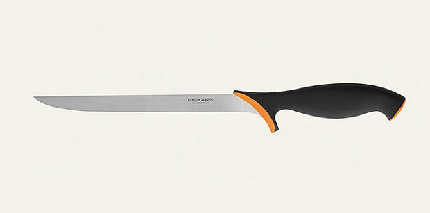 Этим ножом разделывают свежую рыбу — гибкое и тонкое лезвие ловко лавирует между костями и филе. Этот вариант от Fiskars очень удобно ложится в руку, не скользит и стоит смешных денег по сравнению с другими. Нож для филетирования может быть и короче, все зависит от того, рыбу какого размера вы обычно готовите.