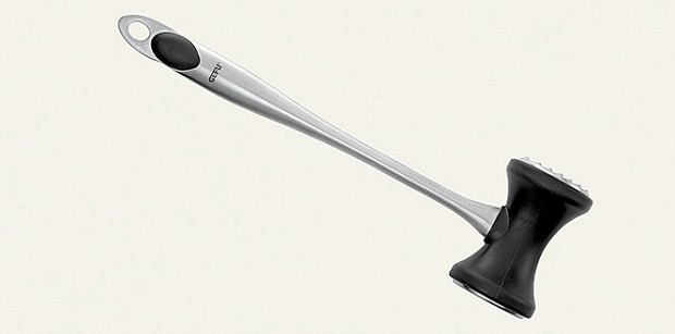 Изначально любой кухонный молоток создан для отбивания кусков мяса. Для рыбы лучше выбирать тот, у которого шипы не острые, а закругленные и есть вторая — плоская — сторона (сейчас такая есть почти у всех). У этого молотка есть серьезный недостаток: ручка для такой тяжелой головы слишком тонкая и выскальзывает из рук. Для рыбы также подойдут молотки с силиконовым покрытием, такие есть у марки Apollo.