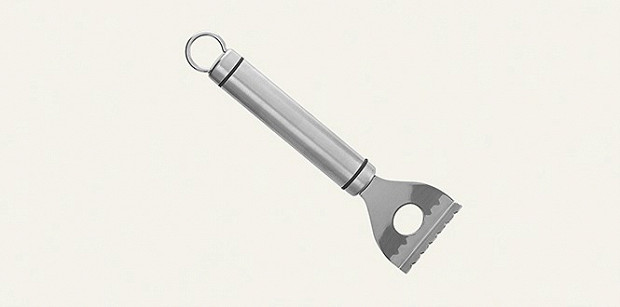 Грязную работу по потрошению рыбы может сделать и продавец на рынке или в магазине. Чешую же можно очистить дома — для этого понадобится скребок. Скребки можно разделить на два вида: те, что похожи на огородную тяпку, — и многосторонние, у которых ряды зубьев торчат в разные стороны. Зубцы скребка равномерно захватывать все чешуйки и не быть острыми, чтобы не царапать рыбье филе. Хороший и недорогой вариант — этот, Tescoma.