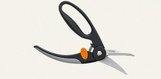 Ножницы нужны для того, чтобы убирать плавники, жабры и прорезать неподатливые кости. Чаще всего для птицы и рыбы используют одни и те же, но у Fiskars есть специализированные. У них прямые короткие лезвия, как раз подходящие для небольших рыбьих масштабов, а одна сторона нижнего лезвия обработана так, что служит заодно скребком для чешуи. В закрытом состоянии ножницы держит специальная защелка.