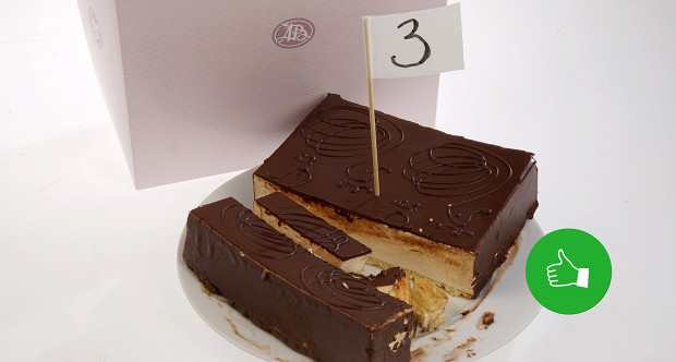 Гуральник: Номер три — форма квадратная, но сверху есть какой-то уже, так сказать, лебедь. Шоколадная глазурь на внешний вид тоже неплохая. Заглазировано хорошо, ровно, аккуратно. (Режет.) О, как много тут глазури. Сдобно-сбивной полуфабрикат на месте. Но в суфле пористости меньше, очень слабенькая масса. Может, оттого, что ее здесь много, ее недоварили.