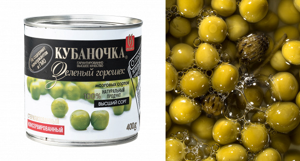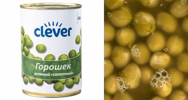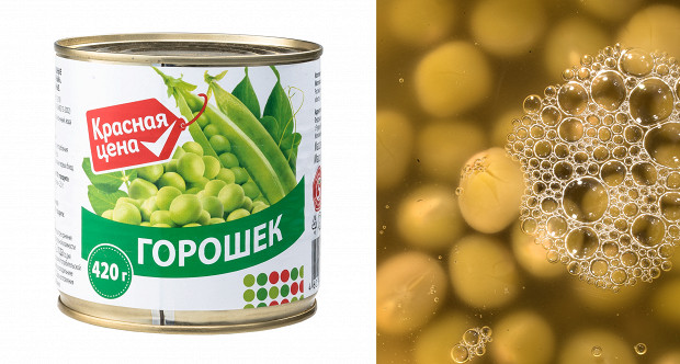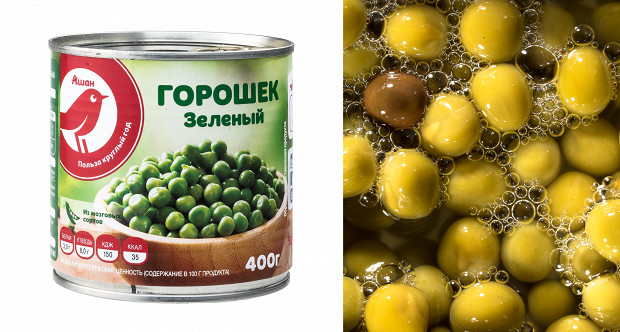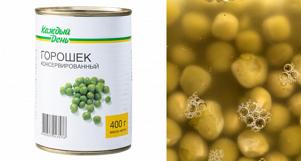Когда мы открыли банку, мы вообще не увидели горошин — так много внутри мутной жидкости. Впрочем, на этикетке указано, что на общий вес в 420 г приходится 210 г гороха, сравните: у других производителей соотношение в среднем 240 г горошка на 400 г общего веса. И вроде не соврали, а на вид неприятно.