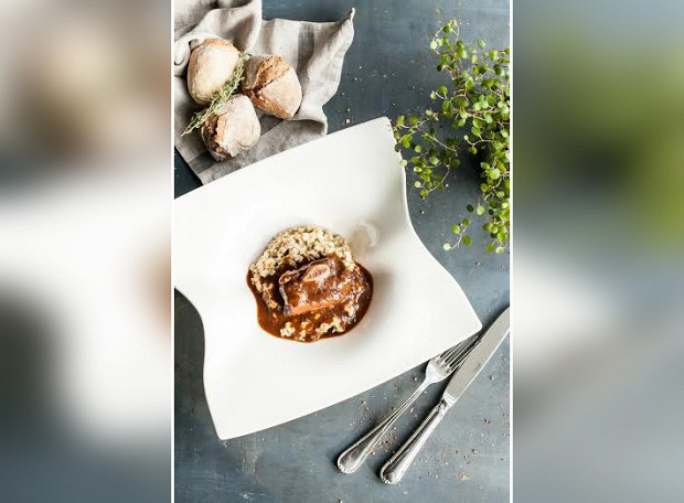 В качестве дополнения к копченым ребрам, которые буквально слезают с костей, шеф-повар Роман Шубин выбрал текстурный контраст — цельные овсяные зерна, сваренные в бульоне точно до состояния аль денте.