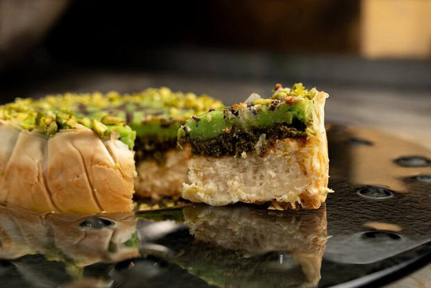 Тему развивает местный чизкейк: сливочный сыр с ароматом ванили разделяют тонкие листы теста фило, в прослойке — жареное катаифи, фисташковая паста и ганаш из белого шоколада, а украшающие пирожное фисташки покрыты пищевым золотом.