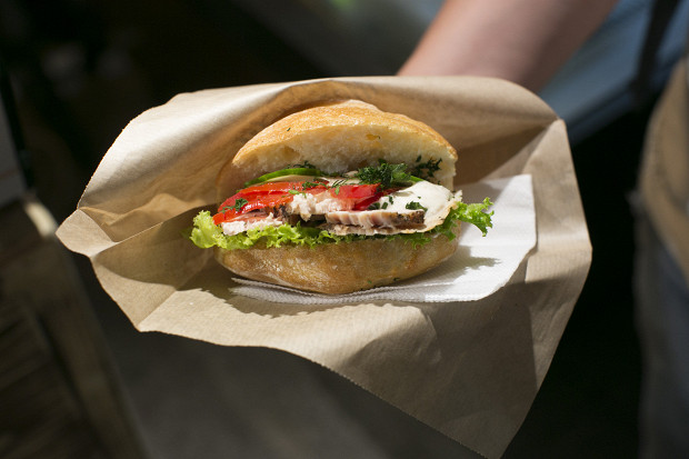Калачи у них небольшие, среднепористые, чуть солоноватые, с легкой корочкой и тоненькой хрустящей ручкой, напоминающей по вкусу гриссини. В них кладут буженину и паштеты, без начинки продают тоже — и вот она, удачная попытка сделать из чего-то исторического, полузабытого, современную еду, а не козулю хоть и заветную, но неразгрызаемую.