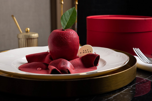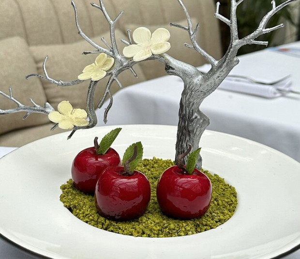 Вытащить на поверхность неброский вкус яблока в десерте еще сложнее, чем персика, но кондитером Cape Антоном Негиным проделана ювелирная работа: под скорлупкой из белого шоколада прячется белый шоколадный ганаш, молекулярных размеров кусочки мякоти красного яблока и яблочный же конфитюр с ароматом розы. Именно чуть уловимые цветочные ноты позволяют зазвучать яблоку в формате 3D, не превращаясь при этом в парфюм. Подача заслуживает отдельного внимания: на каждое яблоко вручную наносят капельки сладкой росы и укладывают на вручную задрапированную канву из бельгийского шоколада. Шикарно! Кстати, мы специально сходили в Cape, чтобы заснять весь процесс создания этого десерта, и обязательно поделимся этим завораживающим зрелищем в одном из наших ближайших видеосюжетов.