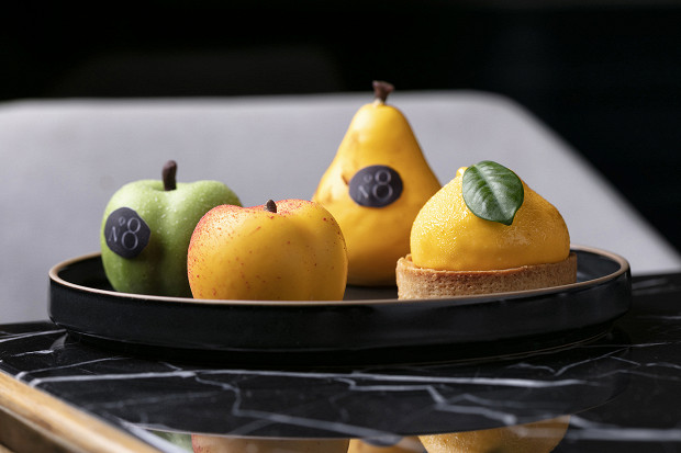 Коллекция фруктовых десертов-обманок, вдохновленная творчеством Седрика Гроле, меняется в «Доме №8» строго по сезону. Обратите внимание на грушу: под «спелой» шоколадной кожицей ярко-желтого цвета (на нее в кондитерской при ресторане даже наносят легкие темные рубцы, как обычно бывает, если не слишком аккуратно обращаться со спелой грушей в реальности) скрывается легкий сливочный крем семифредо с грушевым конфитюром и тончайший миндальный бисквит, который легким хрустом имитирует текстуру грушевой мякоти.