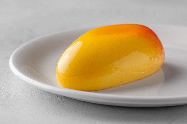 Тут взяты за основу два беспроигрышных тропических вкуса: манго и маракуйя давно плывут одним десертным курсом. Легкий фруктовый мусс заключен в желто-красную оболочку, а внутри скрывается миндальный бисквит и желейный соус кули из тех же экзотических плодов. Сияние, которое десерт излучает на витрине, происходит от так называемого наппажа, то есть нейтральной по вкусу глазури, которой кондитеры часто украшают сладости ради сохранности и глянцевого блеска. Придуманный около года назад для коллаборации с одной из парфюмерных марок, «Манго» стал бестселлером десертной карты и надолго задержался в меню.