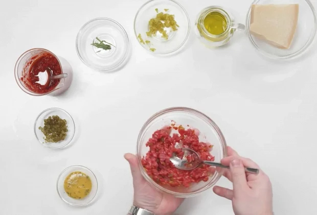 - Тартар можно полить оливковым маслом, чтобы придать ему глянец, именно блеск создает ощущение свежести. Матовые блюда могут показаться гостям заветренными.