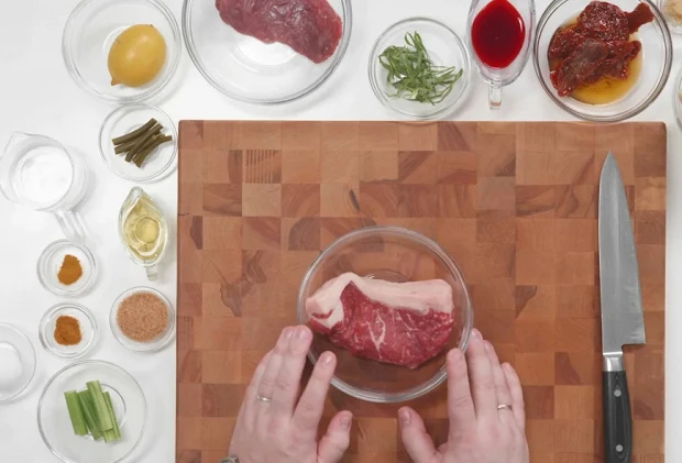 - Если вы хотите, чтобы тартар имел выраженный мясной вкус, используйте альтернативный фланк-стейк из пашины (кстати, подробнее о разных видах стейков и их использовании можете прочитать по этой ссылке). В ресторанах этот стейк тоже часто используют, но все же этот вариант на любителя, так как мясо текстурное и может трудно жеваться.