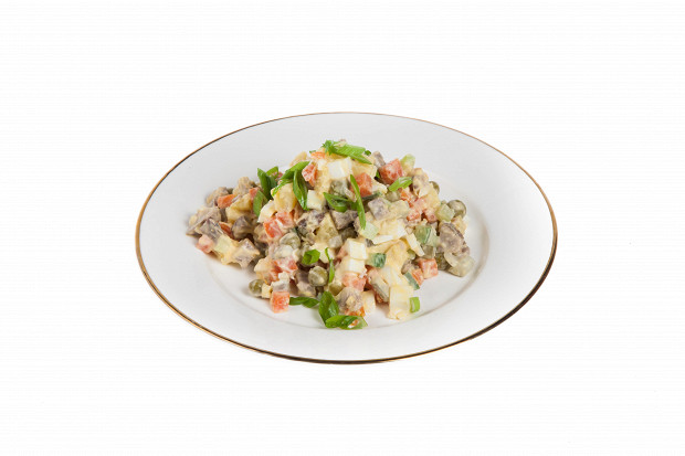 Простейший салат, который заметно украшал будни и был крепкой закуской на праздничном столе. Майонез можно разбавить сметаной, а репчатый лук и вовсе изъять, суть салата не изменится.