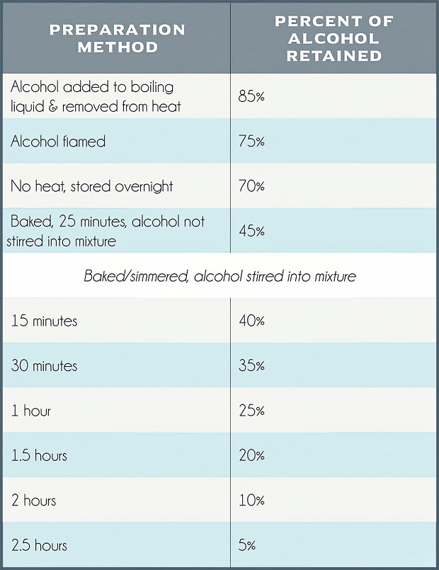 И чтобы примерно понимать, что творится у вас в вашей сковороде или кастрюле во время выпаривания алкоголя, держите под рукой специальную таблицу: в этом руководстве указано объемное содержание этанола в смеси с водой, в зависимости от того, сколько вы ее подвергаете интенсивной термической обработке. Так, например, руководство сообщает нам, что через 15 минут тихого кипения, в жидкости останется 40% от исходного содержания этанола. А через час тихого кипения это уже будет примерно 25% от исходного содержания. А через 2,5 часа останется около 5% от исходного содержания этанола.