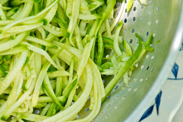 Тертая мякоть кабачка — прекрасная основа для запеканок, оладий и выпечки. Например, с ней можно испечь вот такой вегетарианский брауни с нежной влажной сердцевинкой. В тертом виде кабачок занимает в морозилке минимум места, особенно если разложить его в несколько небольших пакетов или контейнеров в таком количестве, чтобы, разморозив, сразу пустить в дело. Бланшировать кабачковую стружку нужно с особенной деликатностью, чтобы она не размякла в воде и не распалась на молекулы. Лучше всего поместить тертый кабачок на паровую баню: вскипятить воду в кастрюле, сверху поставить дуршлаг подходящего размера и туда выложить кабачок.