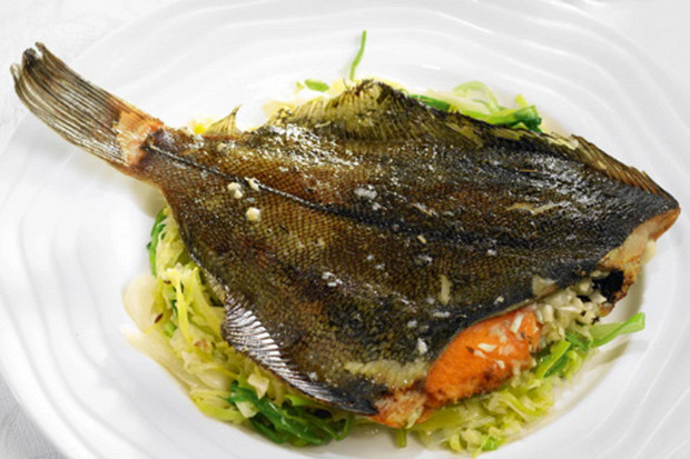 Печеная камбала с капустой и пореем