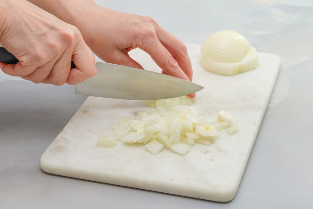 Лайфхак: Чтобы луковица при нарезке не разваливалась, разрежьте ее пополам, положите одну половинку срезом вниз на доску и сделайте продольные разрезы, не доходя до хвостика. Чем чаще будут разрезы – тем мельче в результате получатся кубики. Затем нарежьте лук поперек, делая отступы такими же, как при продольных разрезах.