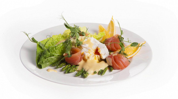 - Положите на тарелку лист салата романо. Рядом выложите подсушенную спаржу. Рядом положите ломтики лосося. Переложите яйцо на тарелку, сверху полейте теплым голландским соусом. Сервируйте двумя дольками лимона, укропом и проростками гороха.