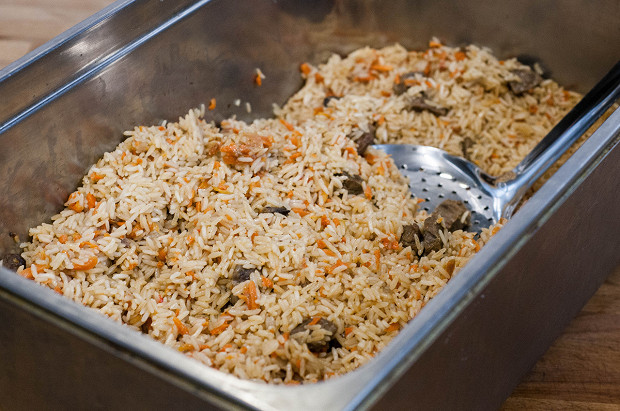 С утра, в 12, можно съесть суп или кашу. Вечером, в пять, у нас полноценный ужин. 90% времени уходит на основные обязанности и только 10% остается, чтобы приготовить что-то себе. Поэтому мы стараемся выбирать нетрудоемкие блюда. Готовим все, от макарон с котлетами до голубцов и лагманов. Не секрет, что на кухне работает много людей из Средней Азии, они часто готовят свои национальные блюда — вот такой плов, например. В сезон мы покупаем овощи, фрукты — можем себе позволить. Делаем салаты, свекольники и так далее. Никто никаких рецептур не соблюдает, готовят как умеют. Если кто-то приготовит невкусную еду — влетит бригадиру. Поэтому он старается ставить на персональскую еду тех, кто умеет готовить по-настоящему, а не просто механически выполняет свою работу».