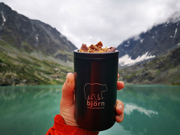 У Никиты Подерягина, шефа ресторана Björn, огромный опыт походов, поэтому слушать его советы было особенно ценно. Шеф порекомендовал поменьше тратить сил на приготовление пищи, после чего протянул упаковку мясной муки. Это дегидрированное мясо, перемолотое в пыль. Можно добавлять как основу для бульона: мясная мука насыщает воду полезными жирами практически мгновенно. А еще ее можно использовать как дополнительную специю.