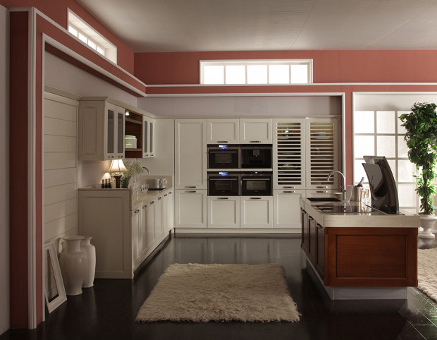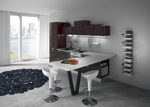 Если вы любите готовить и вам требуется масштаб, идеальным вариантом будет островная планировка кухни. Остров — это не только удобная рабочая поверхность и пара нелишних шкафов, но и возможность оригинально решить планировку кухни, разместив в центре варочную поверхность. Остров можно разместить и у стены: тогда получится удобная стойка для мелкой техники, а основное рабочее пространство не будет загромождено.