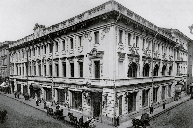 «С утра толпы народа запрудили улицу, любуясь на щегольской фасад «нового стиля» с фронтоном, на котором вместо княжеского герба белелось что-то из мифологии, какие-то классические фигуры. На тротуаре была толчея людей, жадно рассматривавших сквозь зеркальные стекла причудливые постройки из разных неведомых доселе Москве товаров. Горами поднимаются заморские фрукты; как груда ядер, высится пирамида кокосовых орехов, с голову ребенка каждый; необъятными, пудовыми кистями висят тропические бананы; перламутром отливают разноцветные обитатели морского царства — жители неведомых океанских глубин, а над всем этим блещут электрические звезды на батареях винных бутылок, сверкают и переливаются в глубоких зеркалах, вершины которых теряются в туманной высоте», — писал Гиляровский в «Москва и москвичи».