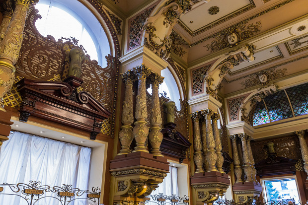 Интерьер поражал своим размахом: ради магазина строители Елисеева объединили первый и второй этажи, создав просторное помещение с невероятной высоты потолком. Под потолком обосновалась жирная лепнина, гигантские зеркала, витражи, позолоченные колонны, хрустальные люстры — все это действительно больше напоминало светский салон, нежели гастрономическую лавку.